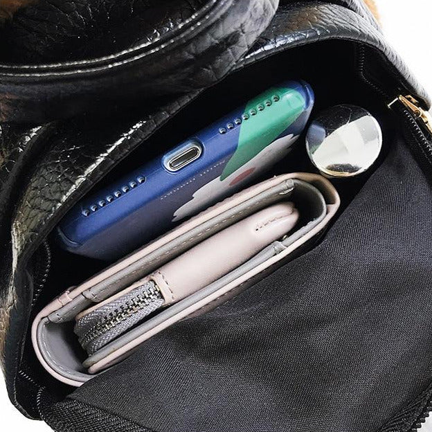 The plush teddy bear is attached to the leather backpack and is comfortable to carry.